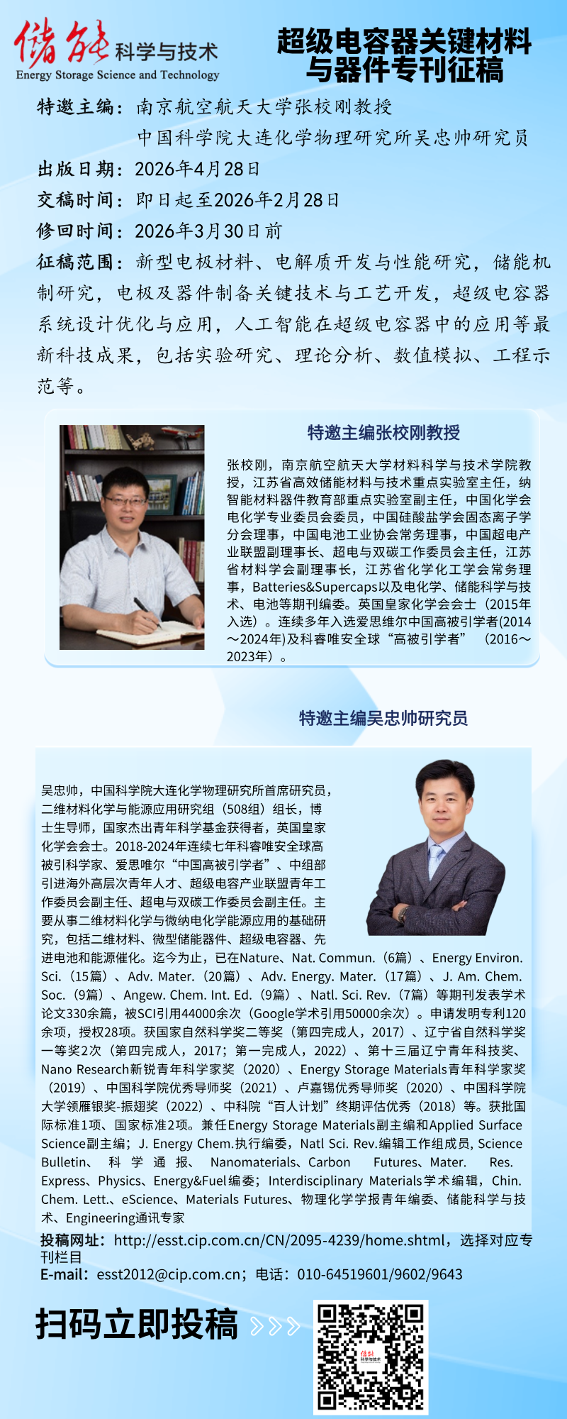 鉴于此,《储能科学与技术》杂志定于2026年4月出版“超级电容器关键材料与器件”专刊,旨在为相关领域的研究人员提供有价值的参考和启示。本专刊特邀主编为南京航空航天大学材料科学与技术学院张校刚教授与中国科学院大连化学物理研究所吴忠帅研究员,欢迎大家踊跃参与。
