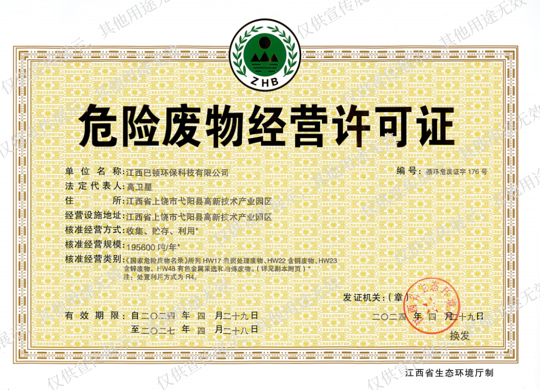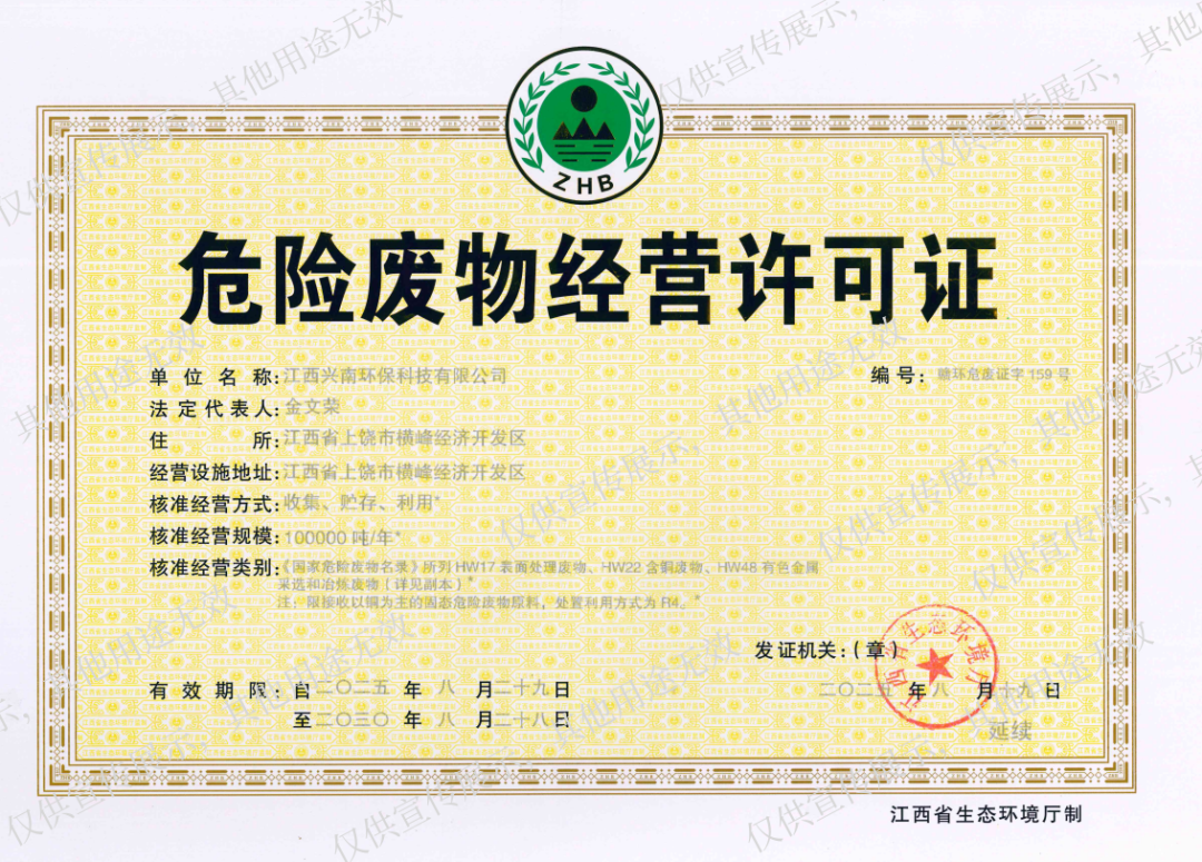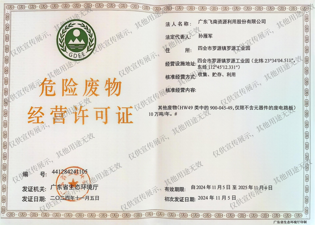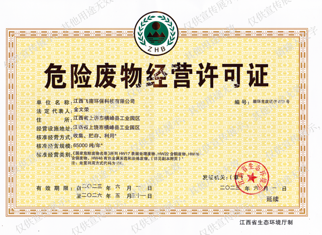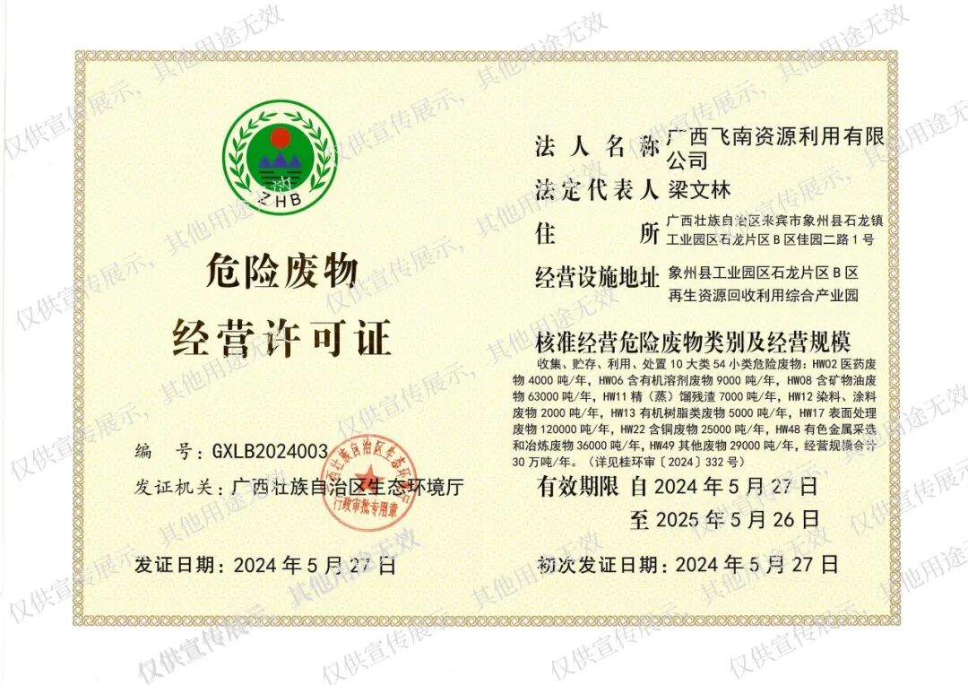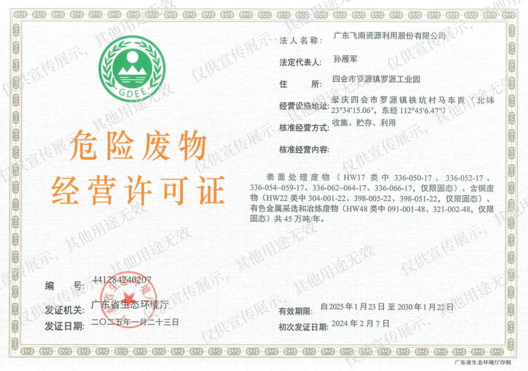 飞南资源取得广东省、江西省、广西壮族自治区多地生态环境厅颁发的《危险废物经营许可证》。