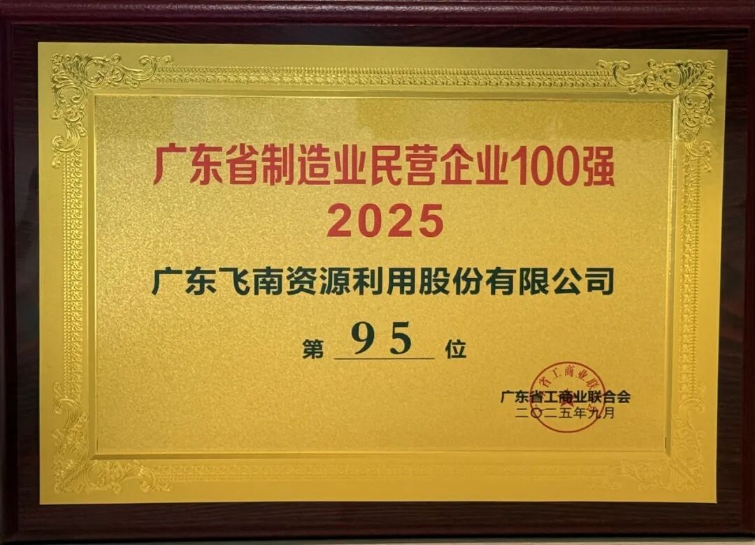 飞南资源凭借雄厚的综合实力、卓越的品牌价值与深厚的产业积淀,从众多优秀企业中脱颖而出,荣耀入选“2025广东省制造业民营企业100强”,位列第95位。这不仅是一份荣誉的加冕,更是对飞南资源在行业内领域深耕不辍、价值贡献的权威认证。