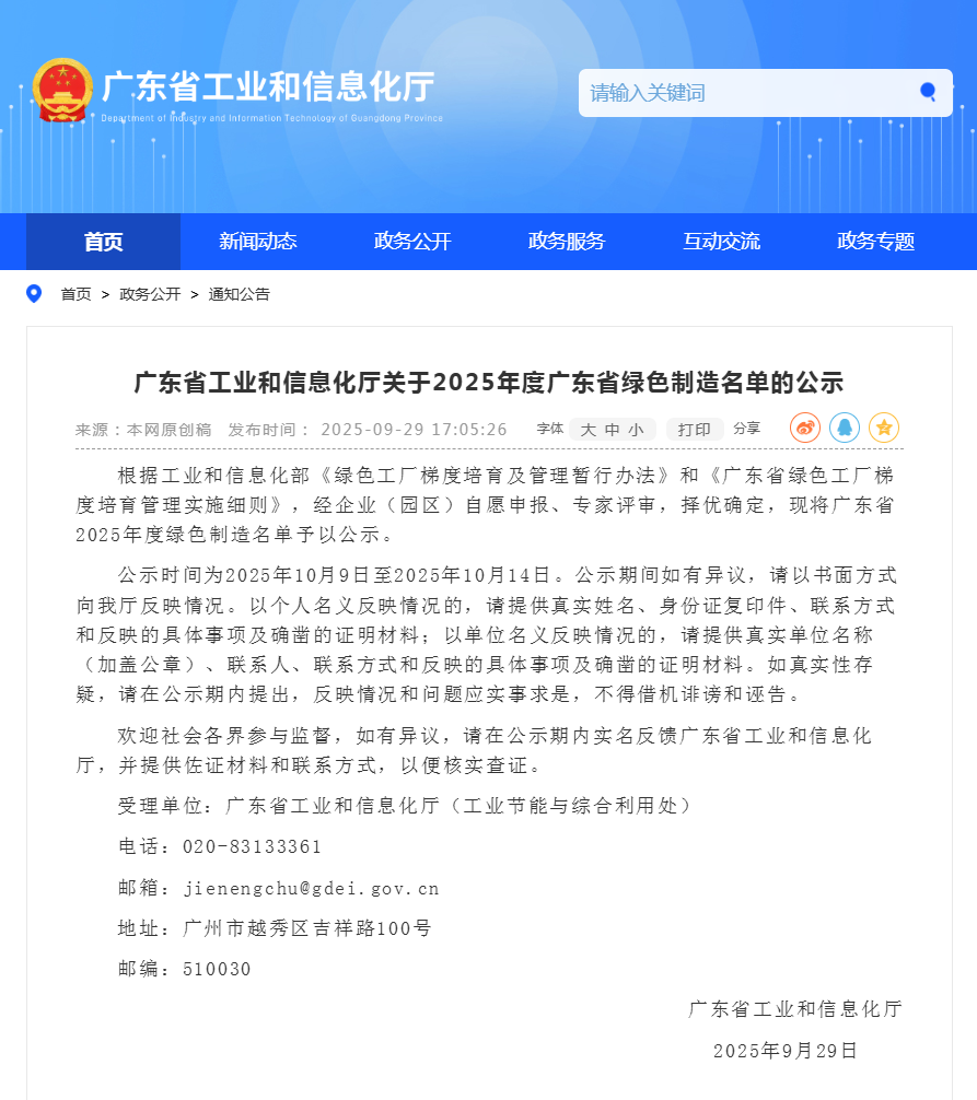 广东省工业和信息化厅正式公布了2025年度广东省绿色制造名单(绿色供应链管理企业)。