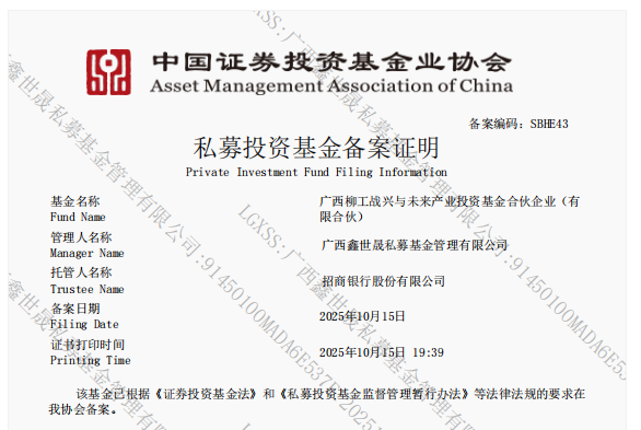 柳工集团积极落实自治区国资委战略部署,联合广西投资引导基金有限责任公司共同发起设立FOF基金,由柳工鑫世晟基金担任基金管理人。柳工战兴未来基金于2025年9月18日完成工商注册,10月15日正式取得《私募投资基金备案证明》,备案编码为SBHE43,总规模10亿元,首期规模2亿元,将聚焦“主业升级+战兴拓展”双主线开展投资布局。