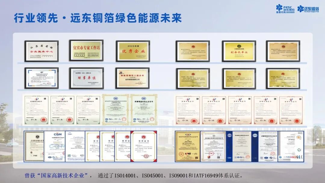能造出如此精密的产品,离不开严苛的制造标准和强劲的技术支撑。远东铜箔坚持 “极致制造” 原则,通过超1000个实时监控点把控品质。凭借过硬的产品性能,公司顺利通过ISO14001、IATF16949 等多项权威体系认证,拿下三十余项专利和省级科技进步奖,成功获评高新技术企业,成为宜宾“1+N”动力电池绿色闭环全产业链生态圈的重要一环。