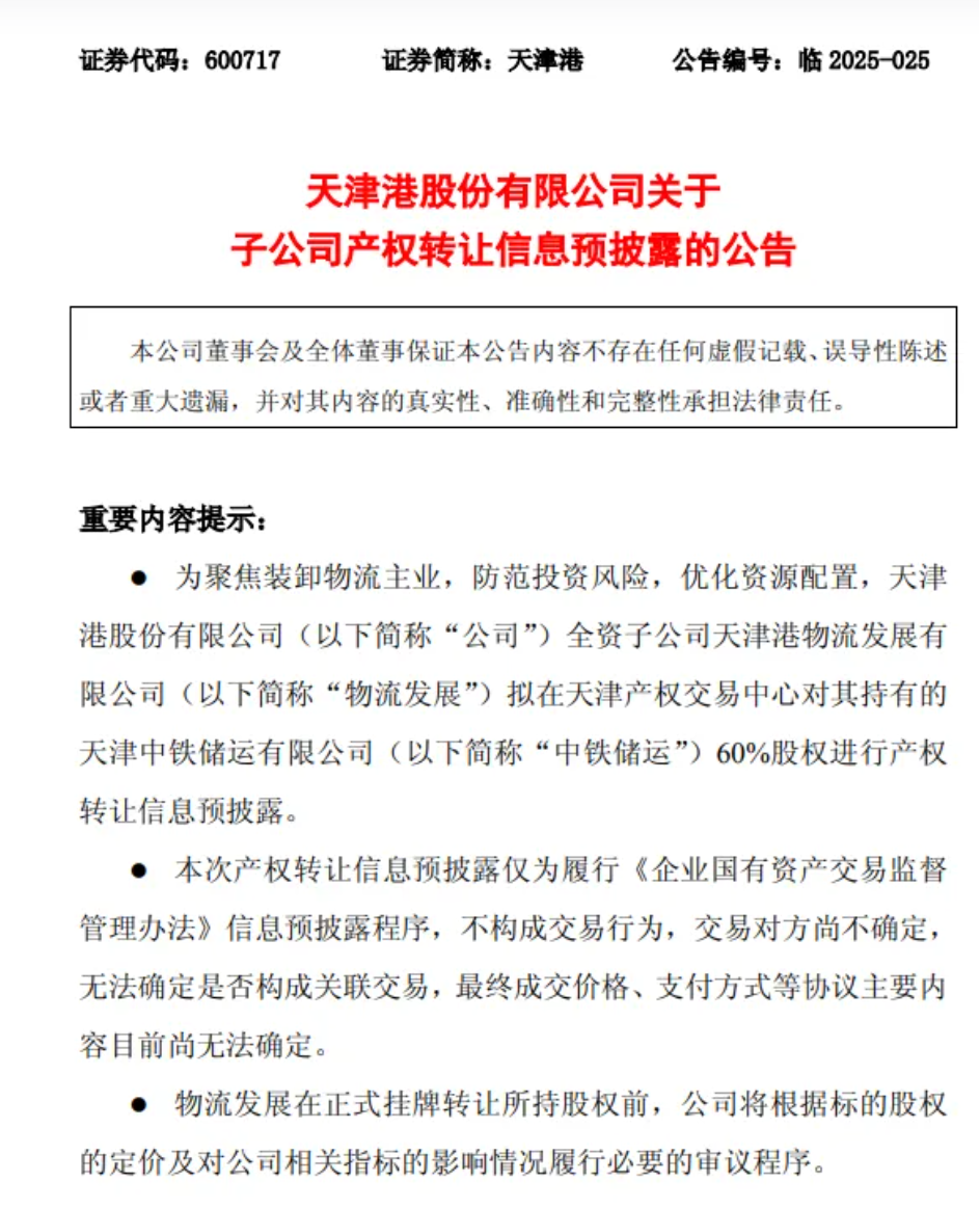上证报中国证券网讯(年悦 记者 张雪)天津港10月22日公告称,公司全资子公司天津港物流发展有限公司(下称“物流发展”)拟对其持有的中铁储运有限公司(下称“中铁储运”)60%股权进行产权转让,旨在聚焦装卸物流主业,防范投资风险,优化资源配置。