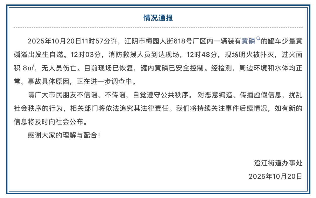 通报显示,事故发生于当天11点57分许,一辆装有黄磷的罐车发生少量泄漏并引发自燃。消防救援人员于12时3分到达现场,并于12时48分将明火扑灭,过火面积8平方米,未造成人员伤亡。
