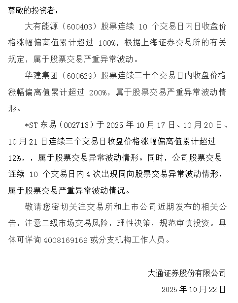 【风险提示】关于大有能源、华建集团、*ST东易交易风险提示公告