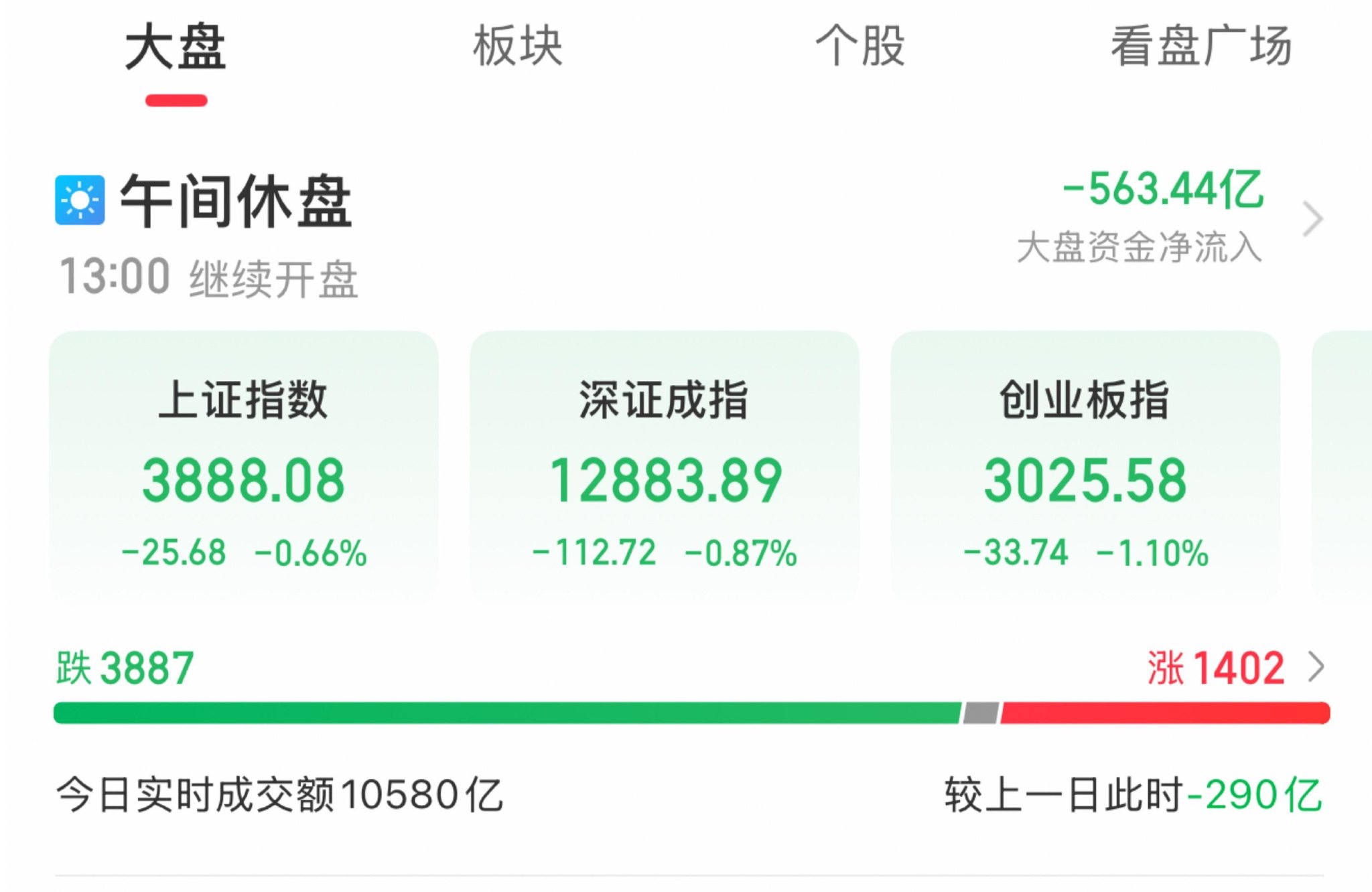 A股三大指数早盘集体下跌,截至午盘,上证指数跌0.66%,深成指跌0.87%,创业板指跌1.1%,北证50跌1.75%。沪深京三市半日成交额10580亿元,较上日缩量290亿元。全市场超3800只个股下跌。