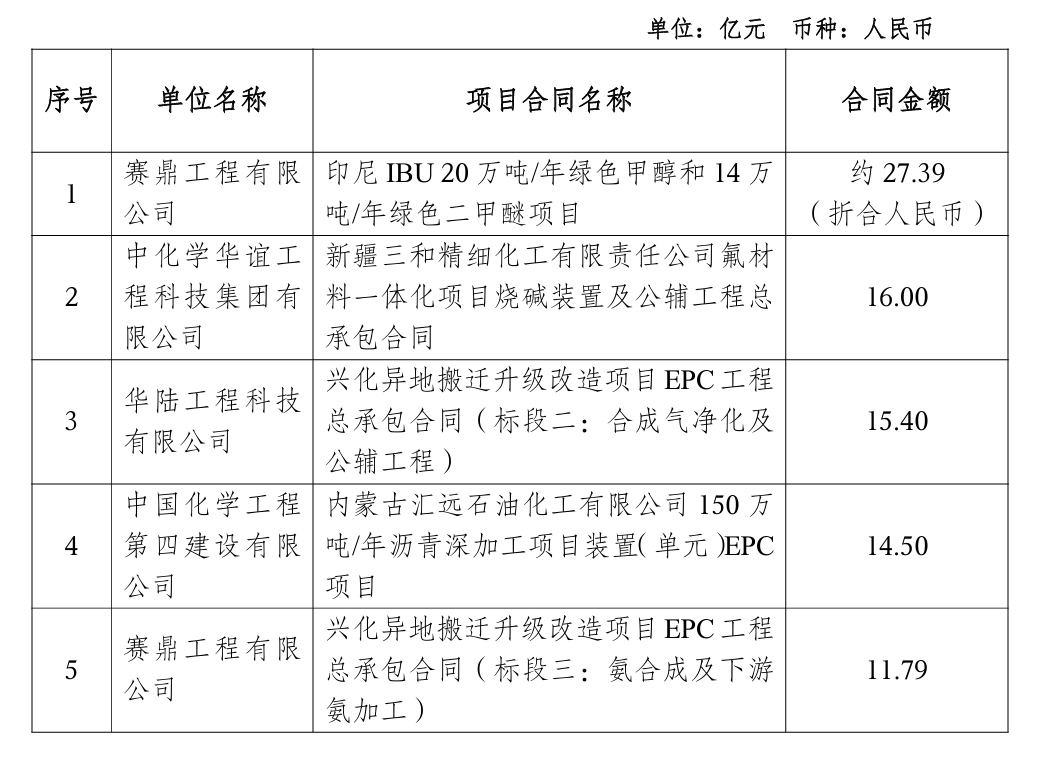其中,9月,该公司单笔合同额在人民币5亿元以上的重大合同如下所示,另外,前9个月,中国化学5亿元以上的重大合同累计78个,在化工新材料这一领域,涉及浙石化、中海壳牌、海辰化学、甘肃巨化等企业。
