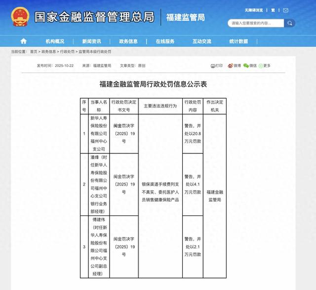 10月22日,国家金融监督管理总局福建监管局的一纸行政处罚决定书,再次将新华保险推向风口浪尖。新华保险福州中心支公司因两项严重违规行为被罚款20.8万元:一是银保渠道手续费列支存在虚假记载,触碰财务真实性底线;二是委托医护人员销售健康保险产品,利用医疗场景信任度实施不当营销。