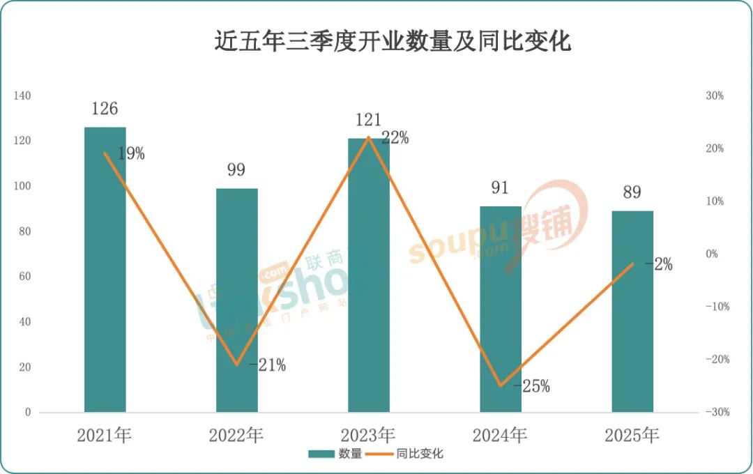 纵观近五年三季度数据,2021年的126家开业量是近五年的最高值,后面涨跌不一,2025年89个的开业量是新低,据联商网统计,这也是自2018年开始计近8年来最低值。这意味着商业地产行业已彻底告别了盲目扩张的增量时代,全面进入以运营为核心的存量深耕时代。