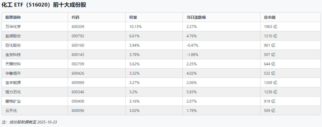 根据ETF查一查小程序(点此直达)数据,截至2025年10月23日,华宝基金旗下的化工 ETF(代码:516020)盘中表现强劲,当日涨幅达 2.06%,成交额为 1.163 亿元,基金最新规模为 28.057 亿元。