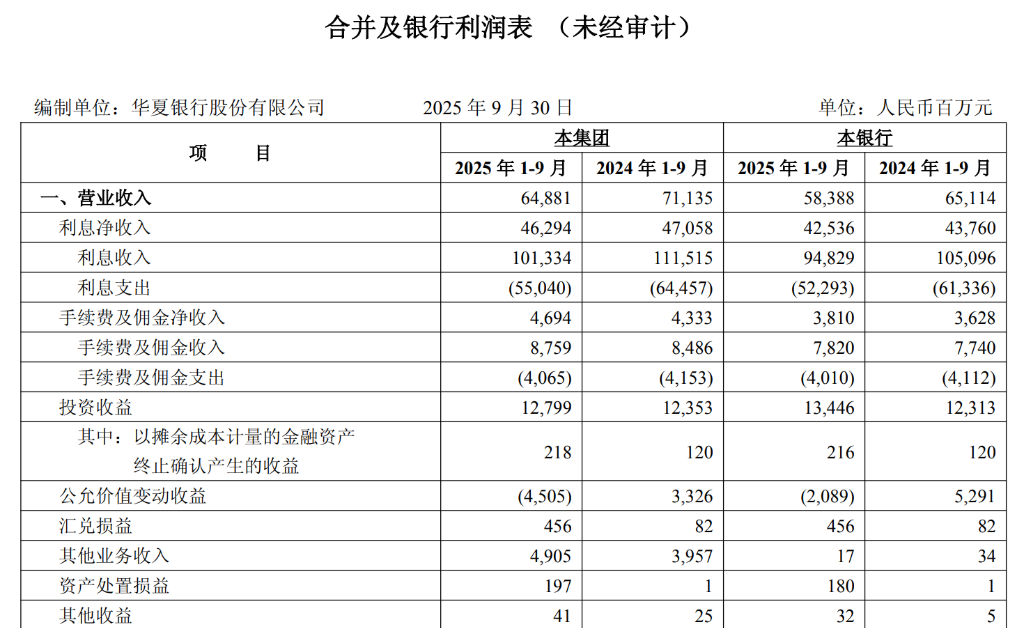 华夏银行三季报显示,2025年1-9月,华夏银行营业收入648.81亿元,同比减少8.79%,比上半年数据多减2.93%;归属于上市公司股东的净利润179.82亿元,同比下降2.86%,比上半年收窄5.09个百分点;成本收入比29.95%,同比下降0.21个百分点。