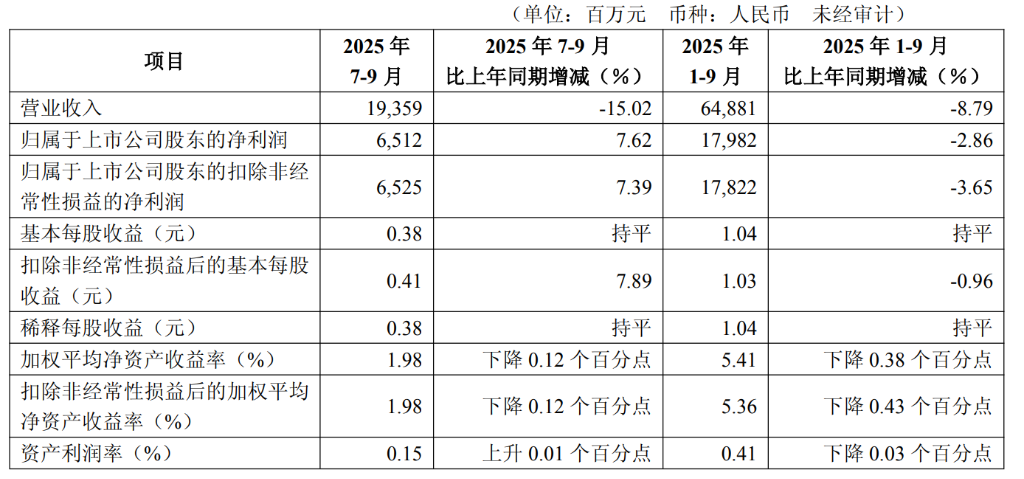 如果具体到2025年7-9月来看,营业收入193.59亿元,同比减少15.02%;归属于上市公司股东的净利润65.12亿元,同比增长7.62%。