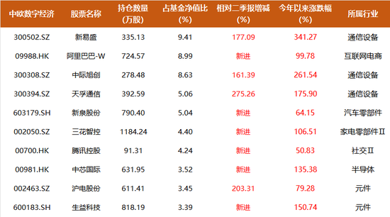 10月23日,中欧基金披露三季报,公司旗下的“翻倍基”—中欧数字经济的最新重仓股也随之曝光。