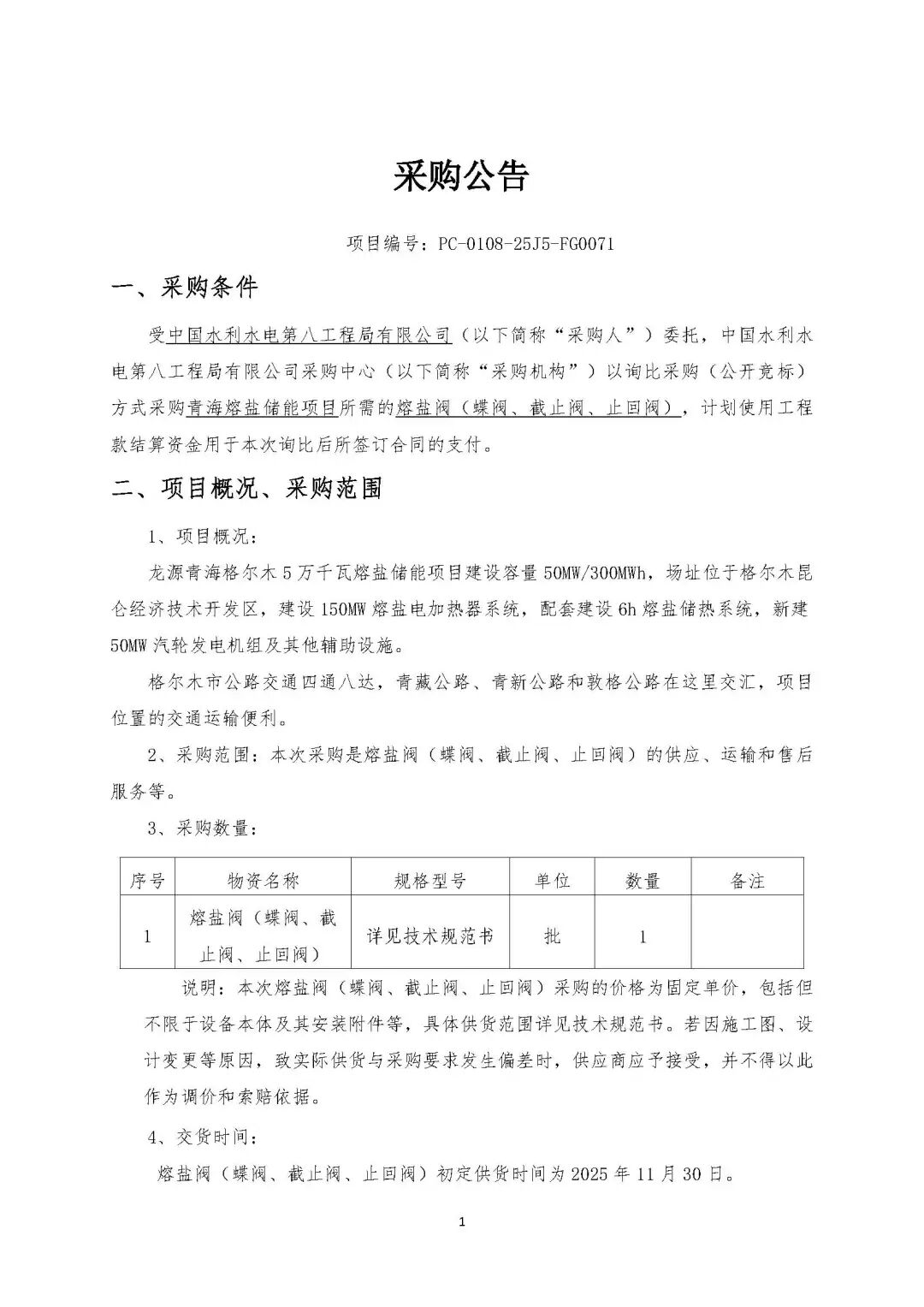 10月23日,中国水利水电第八工程局有限公司就龙源青海格尔木5万千瓦熔盐储能项目熔盐阀(蝶阀、截止阀、止回阀)进行询比采购。