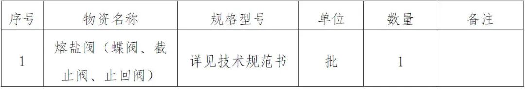 采购范围:本次采购是熔盐阀(蝶阀、截止阀、止回阀)的供应、运输和售后服务等。