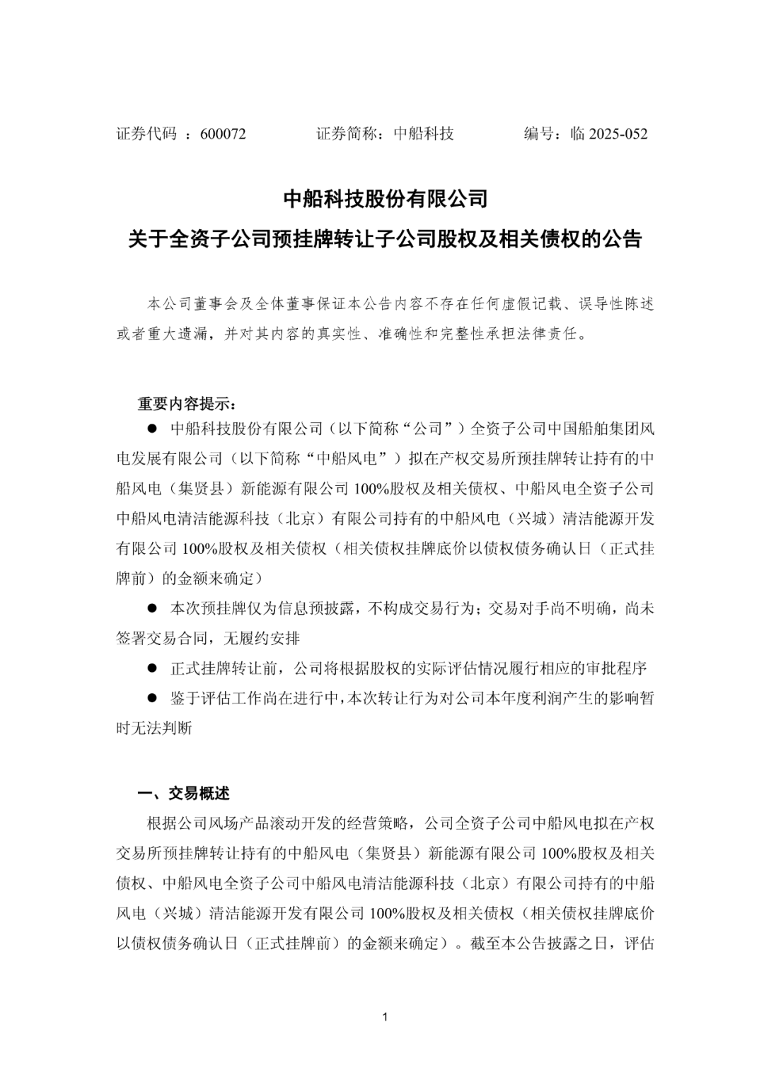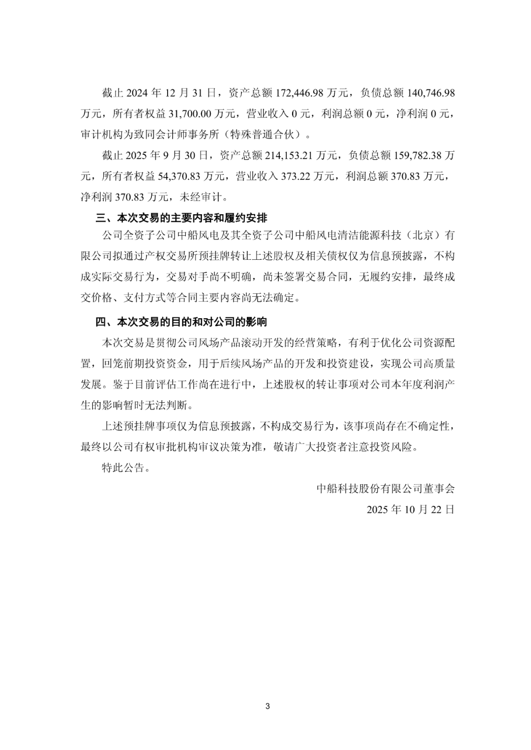 公告指出,根据公司风场产品滚动开发的经营策略,中船科技全资子公司中船风电拟在产权交易所预挂牌转让持有的中船风电(集贤县)新能源有限公司100%股权及相关债权、中船风电全资子公司中船风电清洁能源科技(北京)有限公司持有的中船风电(兴城)清洁能源开发有限公司100%股权及相关债权(相关债权挂牌底价以债权债务确认日(正式挂牌前)的金额来确定)。