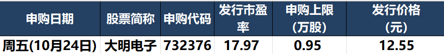 大明电子(732376):申购价格12.55元,申购市盈率:17.97倍,申购上限0.95万股;