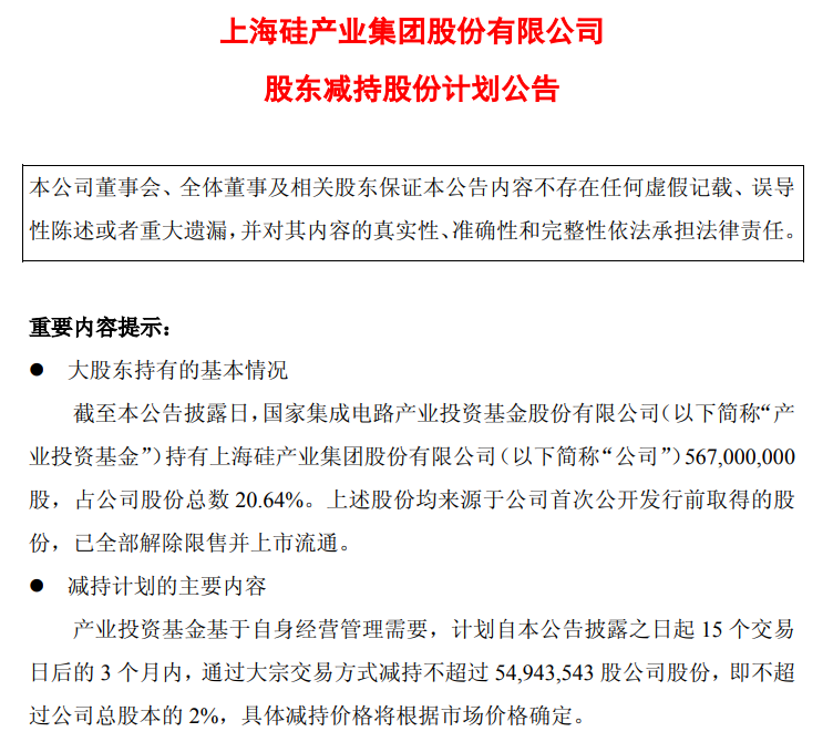 10月24日,沪硅产业(688126.SH)发布公告,国家集成电路产业投资基金股份有限公司(简称“产业投资基金”)金基于自身经营管理需要,计划自公告披露之日起15个交易日后的3个月内,通过大宗交易方式减持不超过5494.35万股公司股份,即不超过公司总股本的2%,具体减持价格将根据市场价格确定。