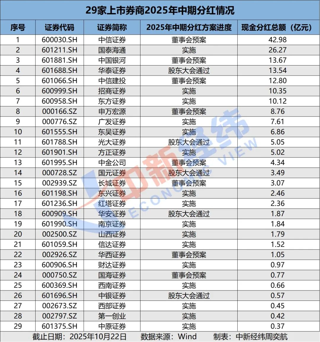 Wind数据显示,截至10月22日,42家A股上市券商中,已有29家上市券商公布了2025年半年度分红方案,拟分红总额合计达191.03亿元,同比增长45.63%。