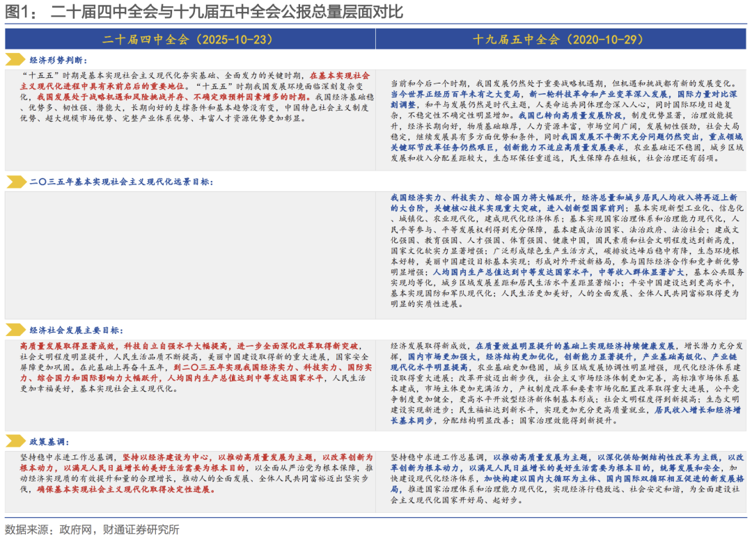 “十五五”经济社会发展主要目标中首先提出“高质量发展取得显著成效,科技自立自强水平大幅提高”,强化了科技在“十五五”期间的主线地位。与此同时,全会提出“全面增强自主创新能力”,“加强原始创新和关键核心技术攻关,推动科技创新和产业创新深度融合”。进一步强调科技中“自立自强”因素。我们预计“十五五”时期先进制造业、新质生产力或成为重点,建议关注半导体、AI、高端设备等自主可控方向,量子技术、类脑智能、核聚变等“未来产业”方向的相关标的。