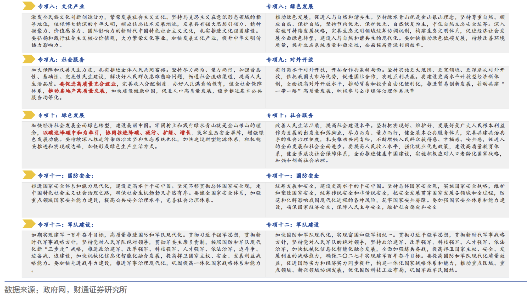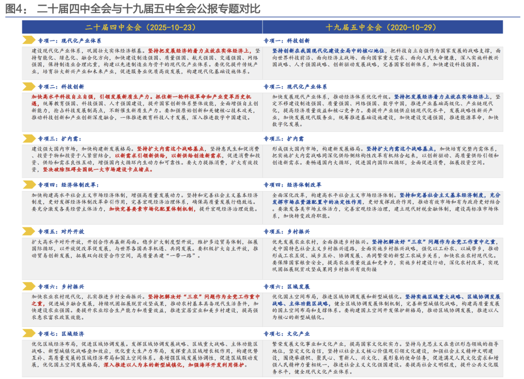 第五,从本次公报的12个专题看,总体方向与十九届五中全会差异不大,只是顺序有调整。其中,现代化产业体系、对外开放、社会服务顺序提前,或许意味着更加强调实体经济增长、扩大高水平对外开放、高质量充分就业和房地产高质量发展。