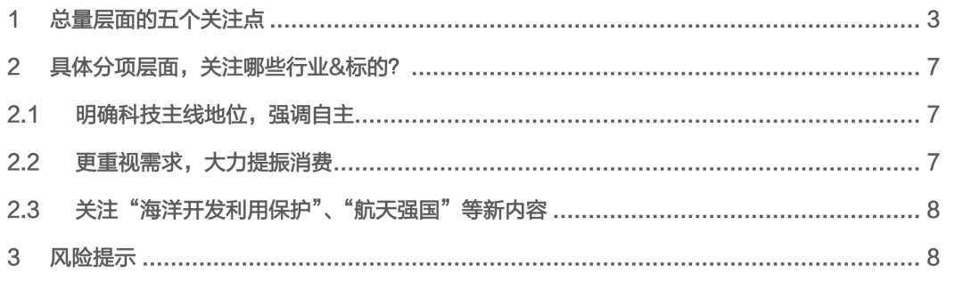 关注科技、消费、海洋/航空航天等方向新内容。(1)本次会议明确科技“十五五”主线地位,强调自主,建议关注半导体、AI、高端设备等自主可控方向,量子技术、类脑智能、核聚变等“未来产业”方向的相关标的;(2)内需方面,本次会议先提需求,“新需求引领新供给”,同时强调大力提振消费,消费提振新举措值得期待,建议关注美护、传媒、新零售、宠物消费、智能消费电子等“新消费”领域相关标的;(3)本次会议新增“加强海洋开发利用保护”、“航天强国”等表述,关注深海经济、海上风电、船舶制造、航空装备、商用航天等领域相关标的。