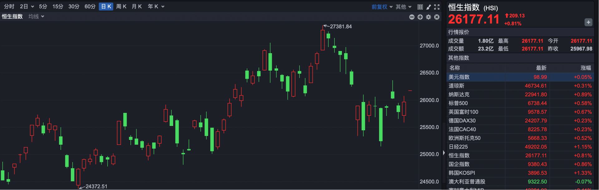 截至发稿,恒生指数报26177点,上涨209点,涨幅0.81%。