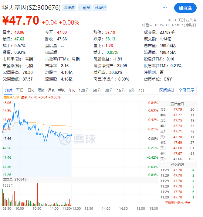 二级市场上,截至10月24日午间收盘,华大基因涨0.08%,报47.7元/股,总市值199.54亿元。
