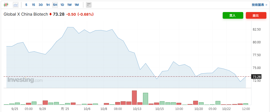 从港股和ETF的走势来看,这一趋势已十分明显。以 Global X中国生物科技ETF(2820.HK)为例,截至10月23日,该ETF的价格为73.28港元,相比本月初82.9港元的高位峰值,累计下跌约11.6%。
