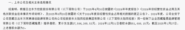 经查明,问题出在2024年度,日出东方全资子公司西藏日出东方阿康清洁能源有限公司向控股股东太阳雨控股集团有限公司同一控制下企业西藏隆晟能源管理有限公司提供借款,累计发生额2758.63万元,2024年12月31日借款余额55.16万元,截至2025年1月27日,借款余额才变为0。而对于这笔关联交易,公司却没及时对外公布,违反了信息披露的规定。
