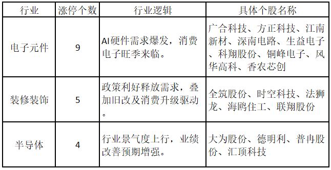 从行业特征来看,今日涨停板个股中,电子元件、装修装饰、半导体行业的个股最多。