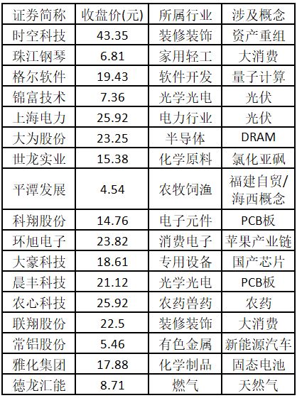 涨停板个股中,股价创出近一年新高的个股有17只(不包括创出历史新高的个股),包括时空科技、珠江钢琴、格尔软件、锦富技术、上海电力、大为股份、世龙实业、平潭发展、科翔股份、环旭电子、大豪科技、晨丰科技、农心科技、联翔股份、常铝股份、雅化集团、德龙汇能,具体如下表所示。