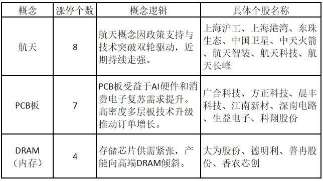 从概念特征来看,今日涨停板个股中,航天、PCB板、DRAM(内存)概念的个股最多。