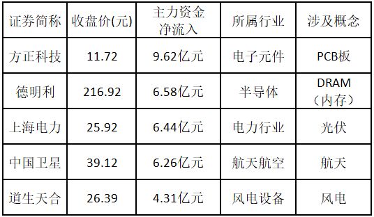 从主力资金来看,今日涨停板个股中,主力资金净流入金额排名前5的个股分别为方正科技、德明利、上海电力、中国卫星、道生天合。