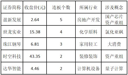 从连板情况来看,今日首板个股有47只;2连板的个股有7只;3连板及以上的个股有3只。今日连板数排名前5的个股包括盈新发展、世龙实业、珠江钢琴、时空科技、达华智能,具体如下表所示。