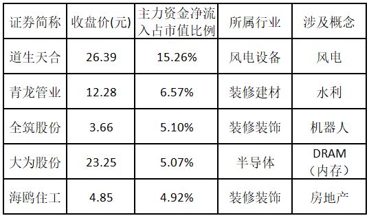 主力资金净流入金额占市值比例排名前5的个股分别为道生天合、青龙管业、全筑股份、大为股份、海鸥住工。欢迎大家关注微信公众号“道达号”,其“道达涨停复盘”栏目为大家解读。