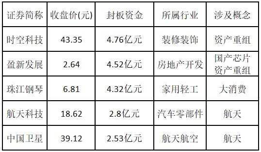 从封板资金来看,今日涨停板个股中,封板资金排名前5的个股包括时空科技、盈新发展、珠江钢琴、航天科技、中国卫星。