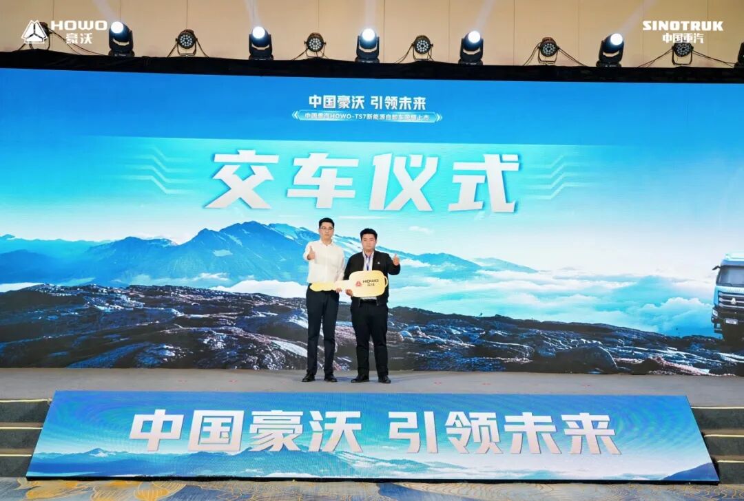 在全场嘉宾的见证下,中国重汽将象征财富的定制钥匙交付给客户。此次交付承载了携手共赢的承诺。金钥匙开启了中国重汽新能源工程车的新篇章。一排崭新的豪沃TS7新能源自卸车,即将驶向创富坦途。