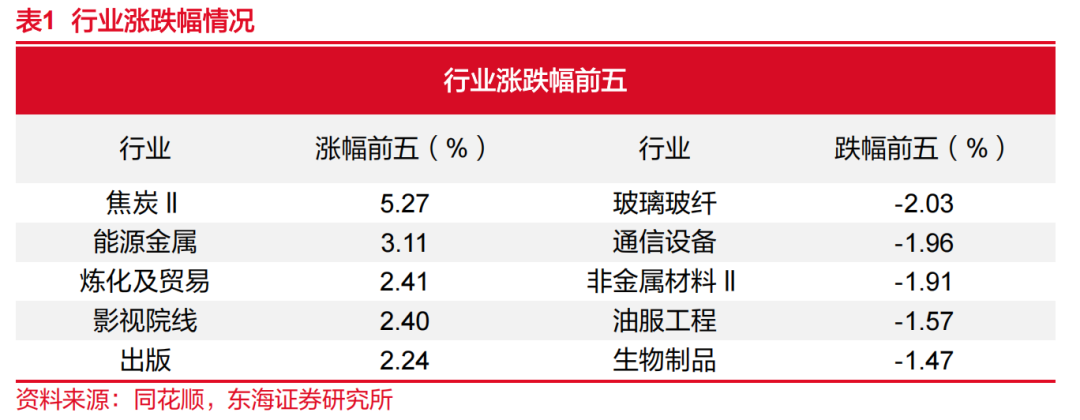 上交易日同花顺行业板块中,煤炭开采加工板块大涨3.99%,涨幅居首。其次,能源金属、影视院线、文化传媒、其他社会服务、证券等板块活跃居前。而工程机械、非金属材料、油气开采及服务、生物制品等板块回落调整居前。能源金属、煤炭开采加工、影视院线、软件开发等板块大单资金净流入居前,而通信设备、汽车零部件、专用设备、半导体、化学制药等板块,大单资金净流出居前。