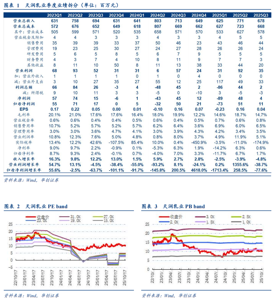 品类结构拖累毛利率明显承压,叠加坏账准备及减值扰动,25Q3盈利大幅下滑。25Q3毛利率为14.72%,同比-5.14pcts,预计主要系加大低价产品销售以应对竞争;销售/管理/研发/财务费用率为6.46%/3.49%/0.78%/0.46%,同比+0.06/-0.36/-0.17/-1.06pcts,销售费用率提升主要系规模效益减弱,财务费用在高基数上有所下降(24Q3新农并表使得财务费用率偏高);信用减值损失占收入的比重同比+1.31pcts,主要系计提学生奶和哺育工程奶应收账款坏账准备。此外,营业外支出占收入比重同比+3.28pcts,预计系淘汰低产牛所致(25Q3牛只存栏5.19万头,环比减少约2500头)。最终净利率为0.64%,同比-5.68pcts。