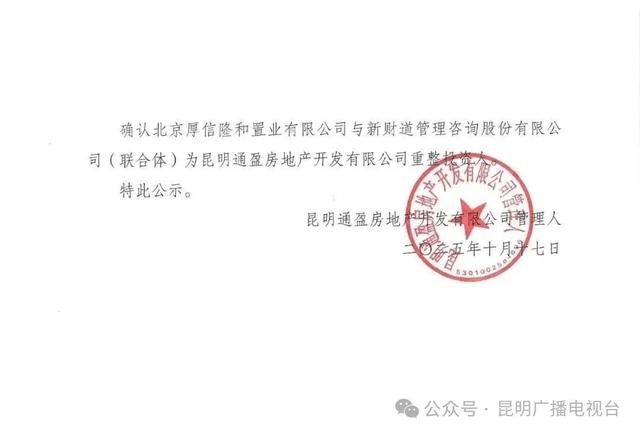 10月17日,昆明通盈房地产开发有限公司管理人正式对外公示,北京厚信隆和置业有限公司与新财道管理咨询股份有限公司(联合体)(以下简称“北京厚信公司联合体”)被确定为通盈地产的重整投资人。