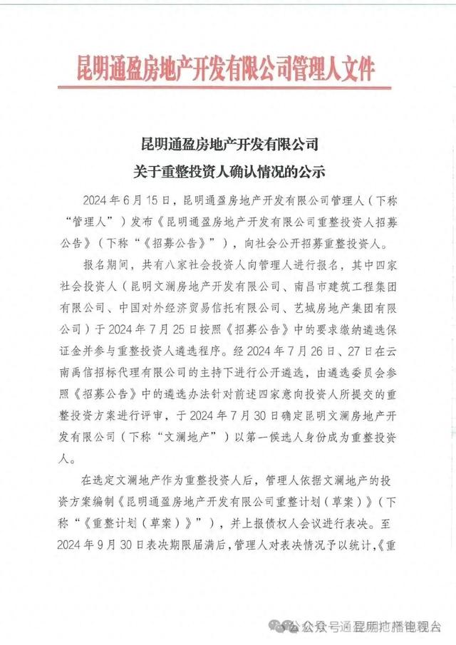 “公示”信息显示,昆明通盈房地产开发有限公司的重整工作自2024年6月15日启动公开招募以来,经历了多次调整与优化。最初,在八家报名社会投资人中,昆明文澜房地产开发有限公司(以下简称“文澜地产”)于2024年7月30日被确定为第一候选重整投资人。然而,在后续《重整计划(草案)》的表决中,该草案未能获得债权人会议通过。