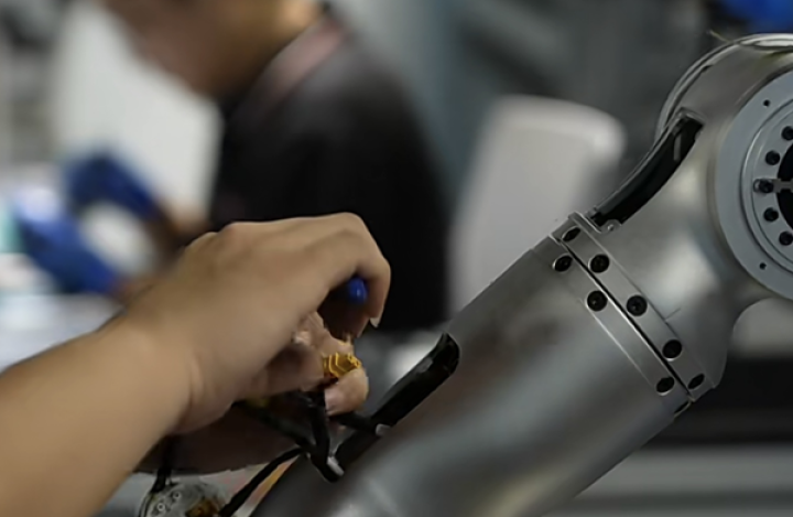 兴业银行青岛分行运用科技创新和技术改造再贷款,给予了国华(青岛)智能装备有限公司1516万元资金支持,利率仅为3.6%。图为国华(青岛)智能装备有限公司工程师正在为新一代具身机器人机械臂装配谐波减速器。