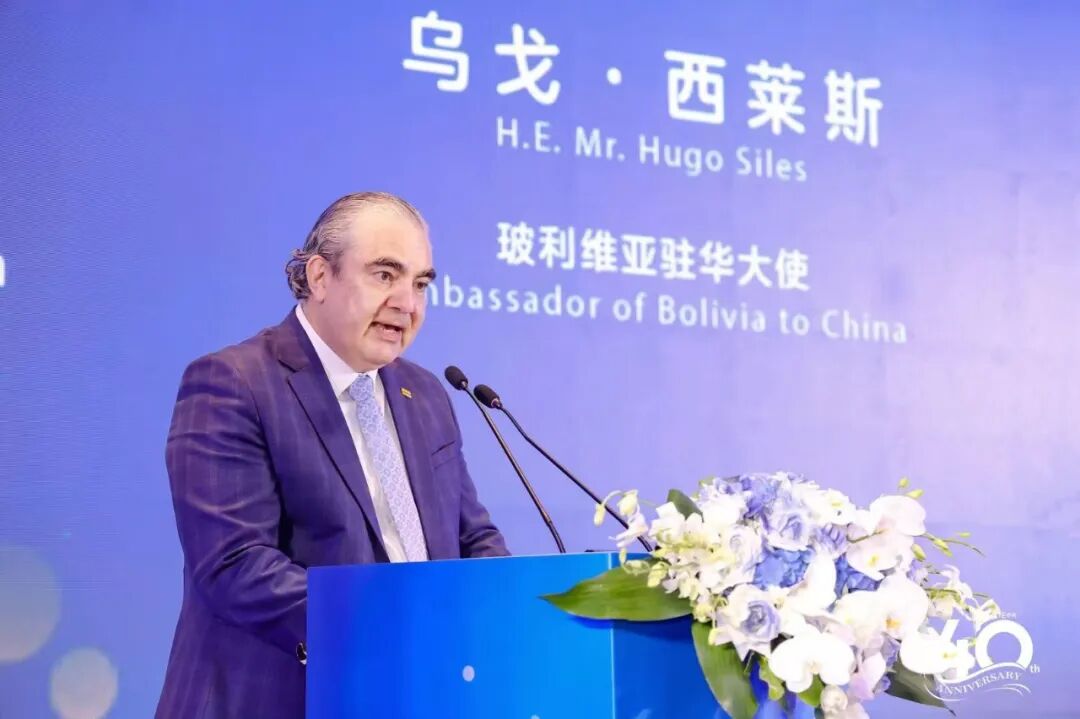 玻利维亚驻华大使乌戈·西莱斯则致辞表示,中兴通讯成立40周年恰逢玻利维亚建国两百周年,更是玻中两国建交40周年。两国始终以合作共赢、友谊长存与融合互鉴为友好关系底色,在国防、经贸等多个领域长期相互支持、深度合作,共同谱写发展新篇章。