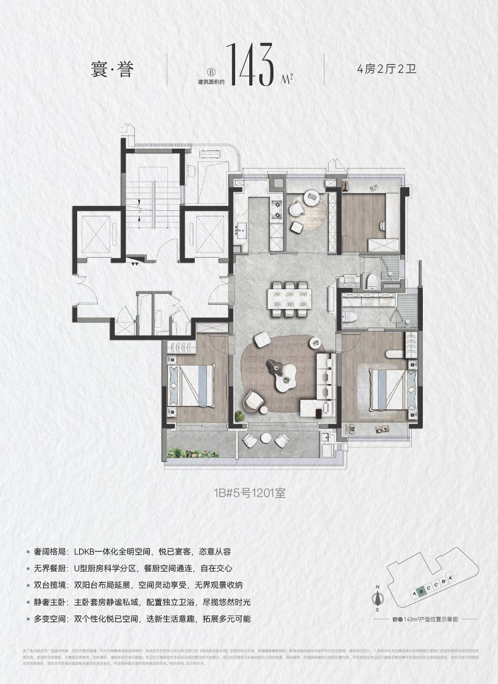项目预计首推建面约143㎡四房户型,该户型设计亮点突出: