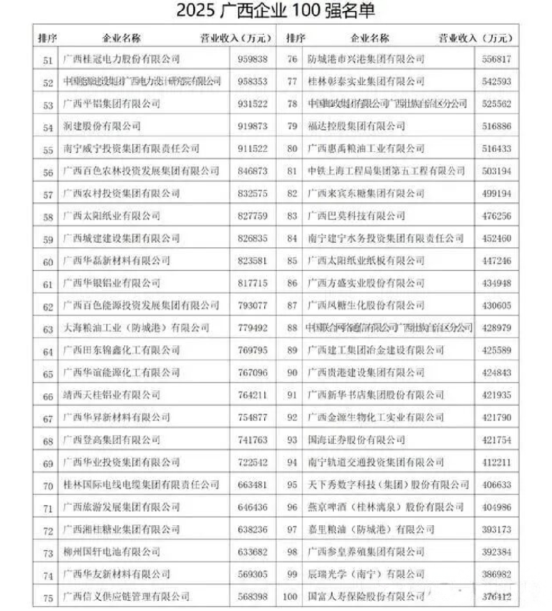 近日,由广西自治区工业和信息化厅指导,广西企业与企业家联合会、广西工业经济联合会联合主办的“2025 年广西企业家活动日”上发布了2025广西企业100强、制造业企业100强、服务业企业100强榜单,并现场解读了《2025广西企业100强发展报告》。