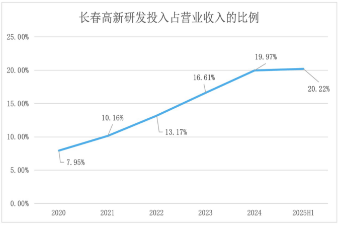 2025年半年度公司研发投入13.35亿元,同比增长17.32%,占当期营业总收入比重已经超过了20%。