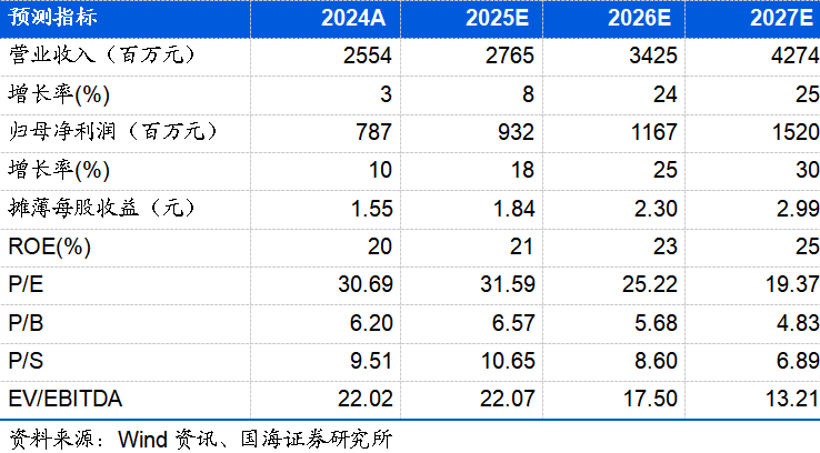 结合2025年前三季度的业绩表现,我们调整了公司的盈利预期,预计公司2025-2027年营业收入分别为27.65、34.25、42.74亿元,归母净利润分别为9.32、11.67、15.20亿元,对应PE分别32、25、19倍,考虑公司的研发优势及长期成长能力,维持“买入”评级。