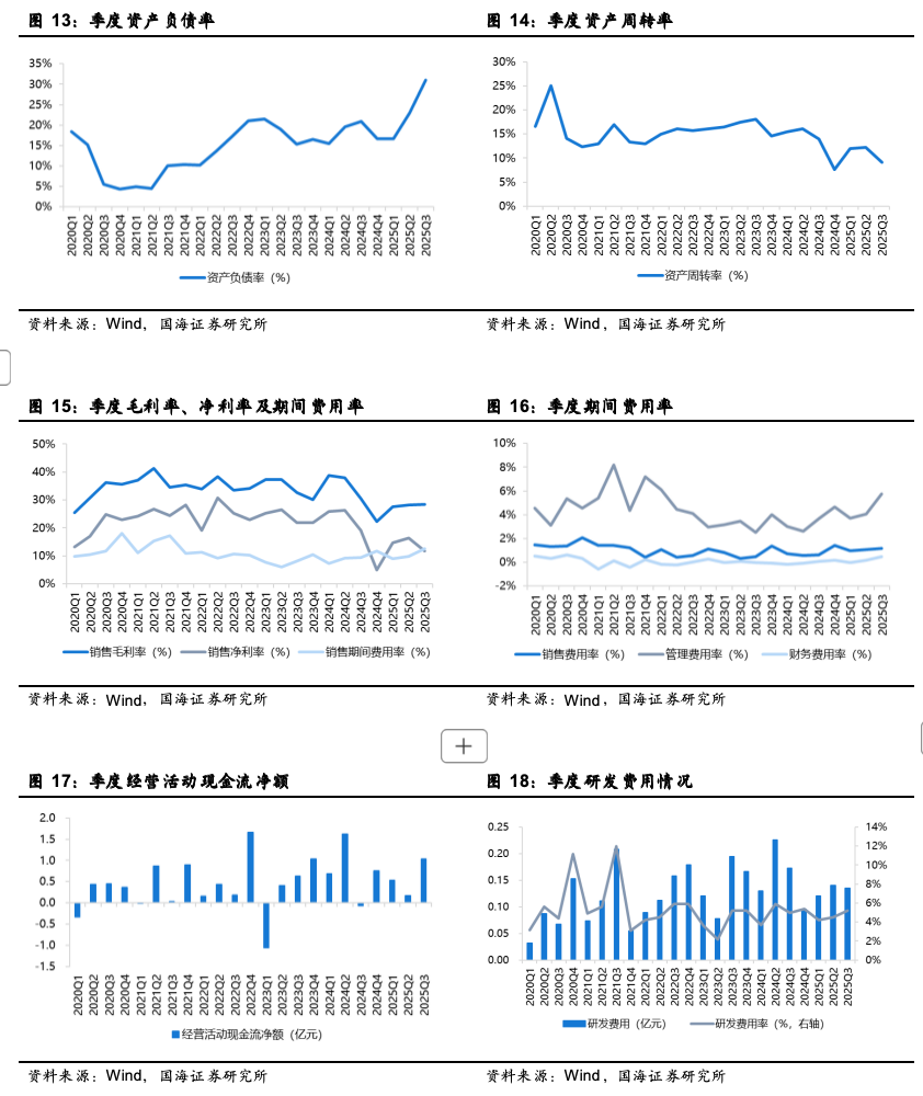 期间费用方面,2025Q3公司销售费用率1.16%,同比+0.53pct,环比+0.06pct;管理费用率5.75%,同比+2.10pct,环比+1.67pct;研发费用率5.21%,同比+0.24pct,环比+0.72pct;财务费用率0.47%,同比+0.38pct,环比+0.28pct。