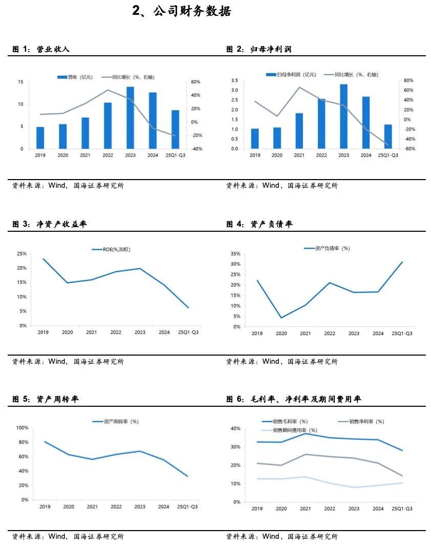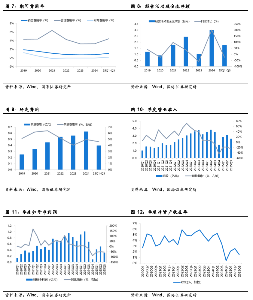 2025Q3公司实现营业收入2.60亿元,同比-25.28%,环比-16.83%;实现归母净利润0.30亿元,同比-54.49%,环比-40.73%;经营活动现金流净额为1.03亿元。ROE为1.54%,同比-1.90pct,环比-1.05pct;销售毛利率为28.33%,同比-2.24pct,环比+0.16pct;销售净利率11.68%,同比-7.50pct,环比-4.71pct。